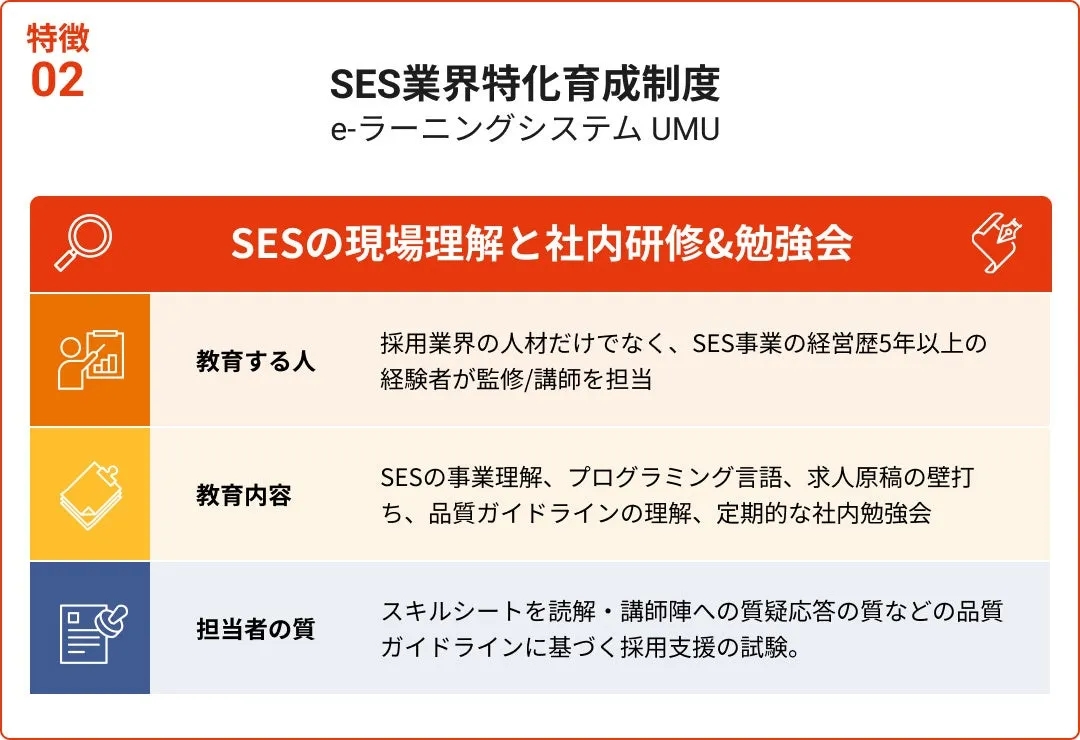 社内でも、SES事業経営5年以上の経験者が講師となり、徹底した育成が行われています。これにより、採用担当者は「SESとは何か」から説明する必要がなく、より本質的な課題解決に時間を費やすことができるでしょう。