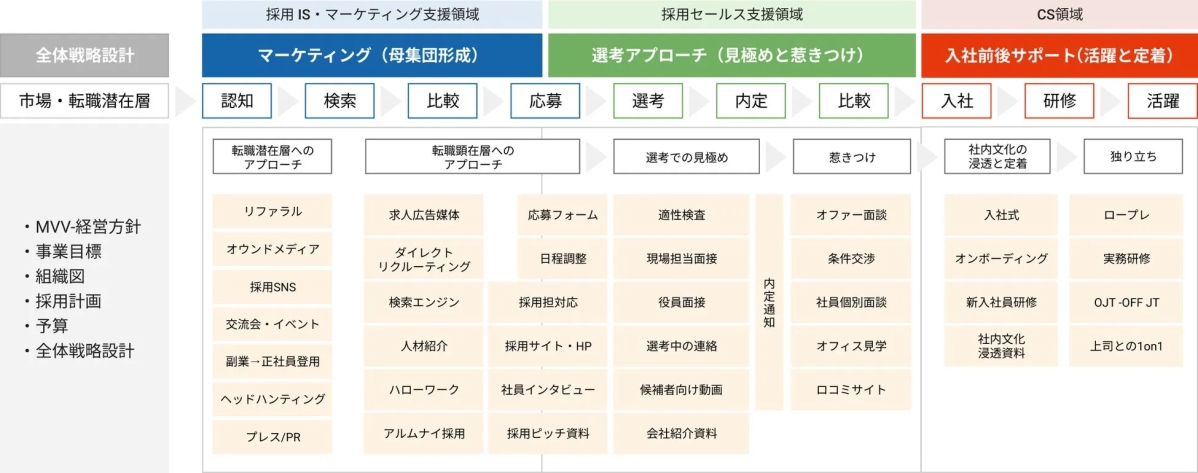 GrowSESは、戦略設計から運用改善まで、採用活動全体を一貫してサポートします。