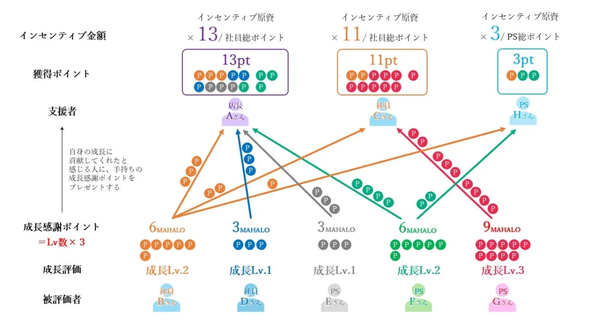 - ・評価レベルに応じて、各従業員に「成長感謝ポイント(MAHALO)」が付与されます。